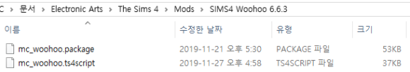 우후어 모드란? 가족 간, 성인과 10대 간의 낭만적인 상호 작용 가능. 기존 심즈4에서 제한되던 상호 작용이 우후어 모드 설치 후에는 모두 가능하며, 단순한 사랑 나누기로도 임신이 될 확률을 조정 가능하게 해주는 모드 다운로드 : MC Woohoo 1) 배포 페이지에서 MC Woohoo 최신버전 파일을 다운받는다 2) 모드 폴더에 SIMS4 Woohoo 폴더를 만들고 폴더명 뒤에 최신 버전 넘버를 붙인다 (폴더명은 마음대로 지정해도 됩니다) : 2020/01/23 현재 최신 버전은 6.6.3이므로 SIMS4 Woohoo 6.6.3로 폴더명 지정 3) 다운받은 파일을 SIMS4 MCCC x.x.x 폴더에 압축을 푼다 (꼭 압축을 풀어야 하며, 2번은 생략하고 바로 압축해제해도 가능) ![]() ![]() |