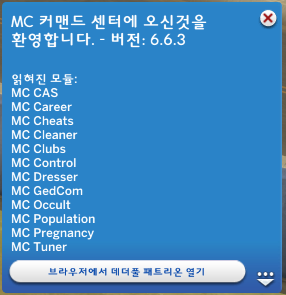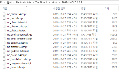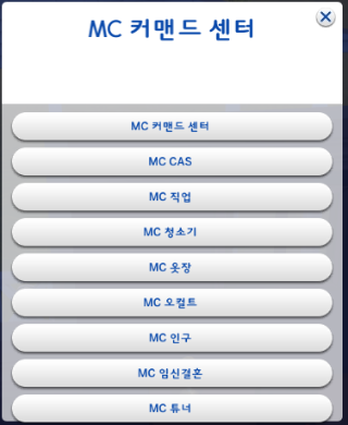 MCCC란? MC Command Center의 약자로 스토리 모드라고도 불리며 심만들기 수정, 치트, 옷장, 임신결혼, 심유형, 심관리, 심관계 등을 관리할 수 있고, 말 그대로 스토리를 만들어 플레이가 가능하게 하는 모드 다운로드 : MC Command Center 1) MCCC 배포 페이지에서 최신 버전 파일을 다운받는다 2) 모드 폴더에 SIMS4 MCCC 폴더를 만들고 폴더명 뒤에 최신 버전 넘버를 붙인다 (폴더명은 마음대로 지정해도 됩니다) : 2020/01/23 현재 최신 버전은 6.6.3이므로 SIMS4 MCCC 6.6.3으로 폴더명 지정 3) 다운받은 파일을 SIMS4 MCCC x.x.x 폴더에 압축을 푼다 (꼭 압축을 풀어야 하며, 2번은 생략하고 바로 압축해제해도 가능) ![]() ![]() ∎ LastException 예외 오류 로그파일이 생길 때 감지해서 인게임에서 주황색 경고창을 띄워주는 기능이 있기 때문에 이 모드를 가장 먼저 설치하는 걸 추천한다 ![]() |