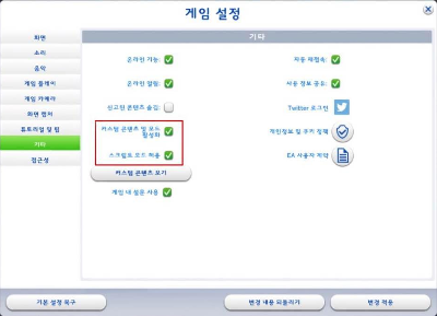 * 모드와 CC템을 적용하기 위해선 먼저 설정에서 아래의 빨간 박스 안에 있는 것들을 체크해주셔야 합니다!! 꼭!!!